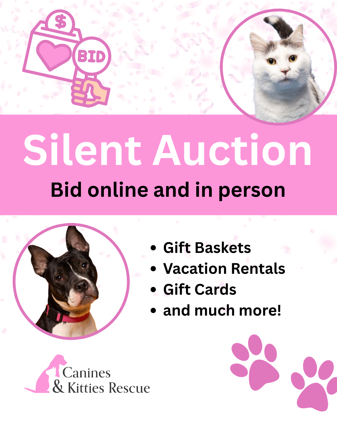 Bid online or better yet, come in person to our Bingo Fundraiser and Silent Auction! Dinner Included. Tickets must be purchased in advance: 🐾 Bingo Night Fundraiser for Canines & Kitties Rescue