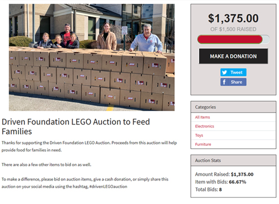 However, Roy found a perfect solution: When he wondered what good he could do with his children’s abandoned Lego bricks and looked into online auctions, he found CharityAuctionsToday.com. Roy signed up and quickly created the “Driven Foundation LEGO Auction to Feed Families”.