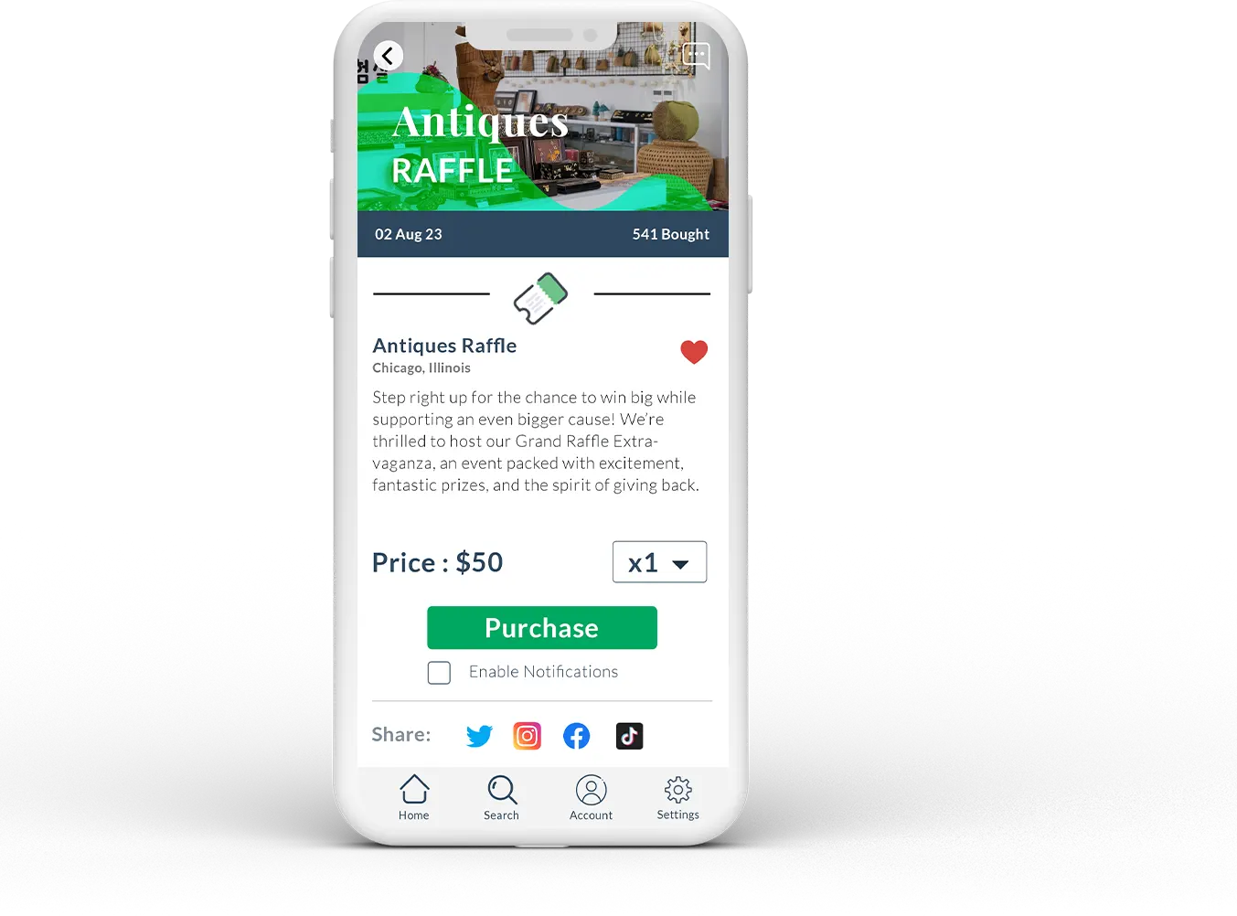 Go digital with your raffle tickets and set your preferences for cost and how many an individual can buy. Run chance auctions, drawings, or prizes.
